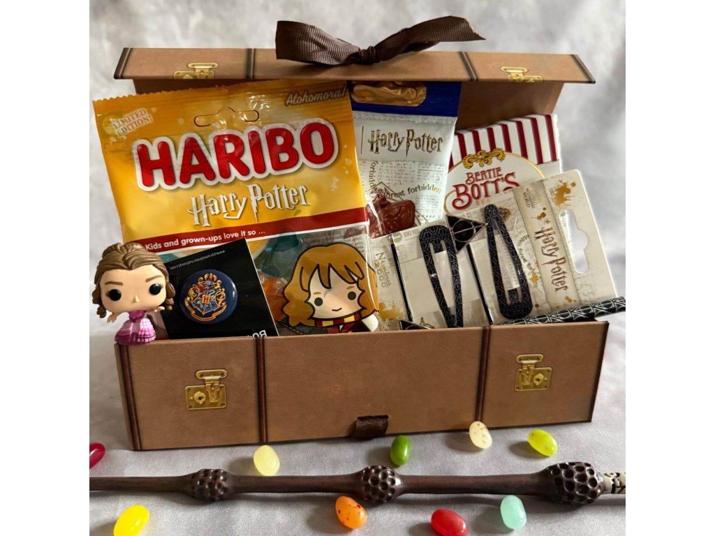 - A készlet tartalmaz: Ajándékdobozt Bertie-féle Mindenízű drazséval, csokibékát, Halálereklye toll, Halálereklye hajcsat, Hermione Granger Haribo bonbon és eredeti Roxforti ajándékkoffer masnival