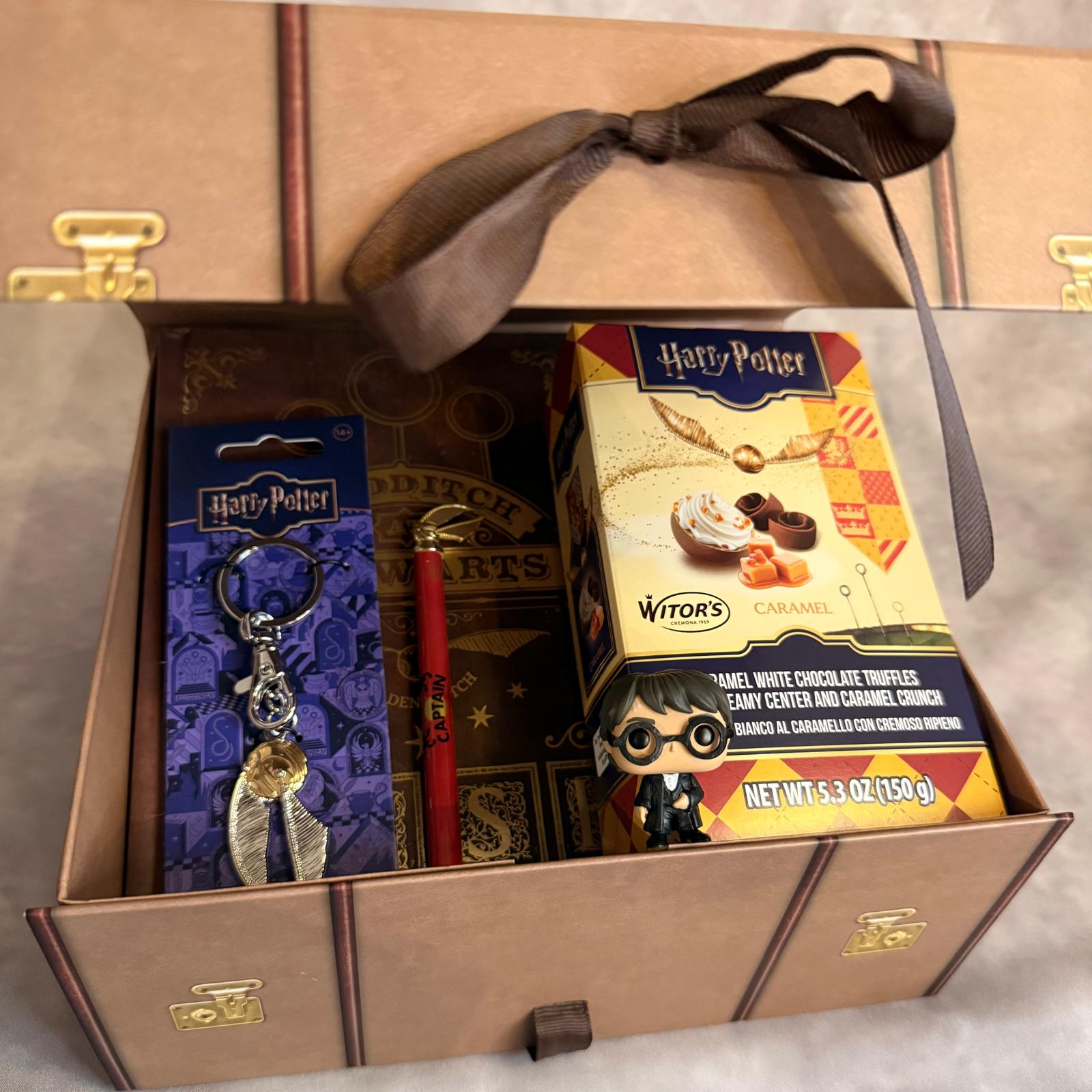 A szett tartalmaz egy nagy roxforti ajándék kufrikot, karamell ízű csokoládé Arany Cikeszeket, Arany Cikesz kulcstartót, Arany Cikesz tollat és egy Prémium Kviddics jegyzetfüzetet. Minden a nagy Roxfort-mintás kufrikban érkezik.