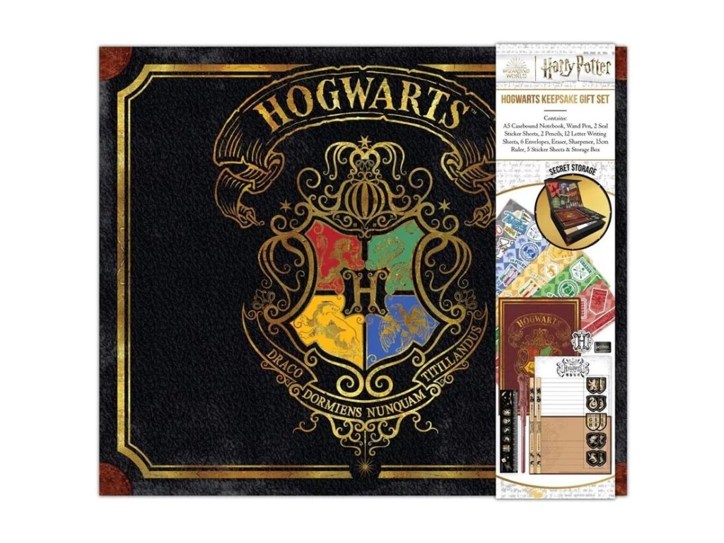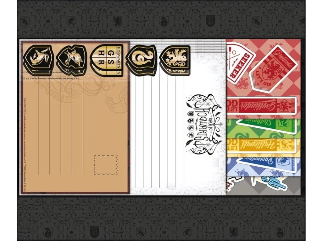 A Harry Potter Varázskoffer ajándékszett összesen 11 varázslatos tárgyat tartalmaz – A5-ös vonalas jegyzetfüzetet, pálca alakú tollat, 2 ív viaszpecsét-matricát, 2 ceruzát, 12 levélpapírt, 6 borítékot, radírt, hegyezőt, 15 cm-es vonalzót és 5 ív matricát. Minden elem a négy roxforti ház színeiben és stílusában készült, így úgy írhatsz levelet, mint egy igazi varázsló vagy boszorkány.