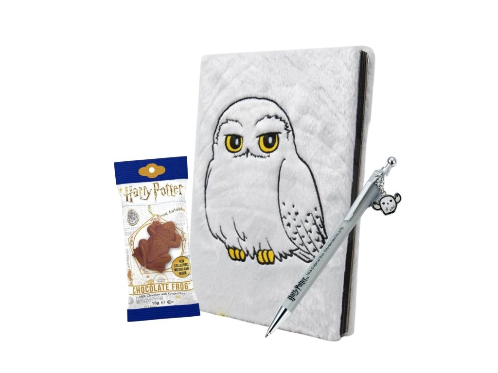 A csomag tartalmaz egy plüss jegyzetfüzetet Hedvig motívummal, egy elegáns tollat bagoly medállal, valamint az ikonikus csokoládébékát gyűjthető varázslókártyával. Minden részlet azok számára készült, akik szeretnének egy kis varázslatot maguknál tudni.
