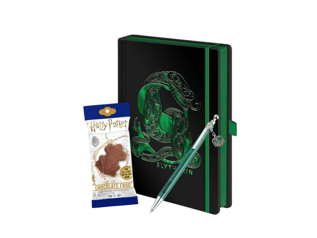 A csomag tartalmaz egy jegyzetfüzetet Mardekár címerrel, egy minőségi tollat Mardekár medállal, valamint az ikonikus csokoládébékát gyűjthető varázslókártyával. Minden darab a büszkeséget és a hagyományt tükrözi, amely ezt a legendás roxforti házat jellemzi.