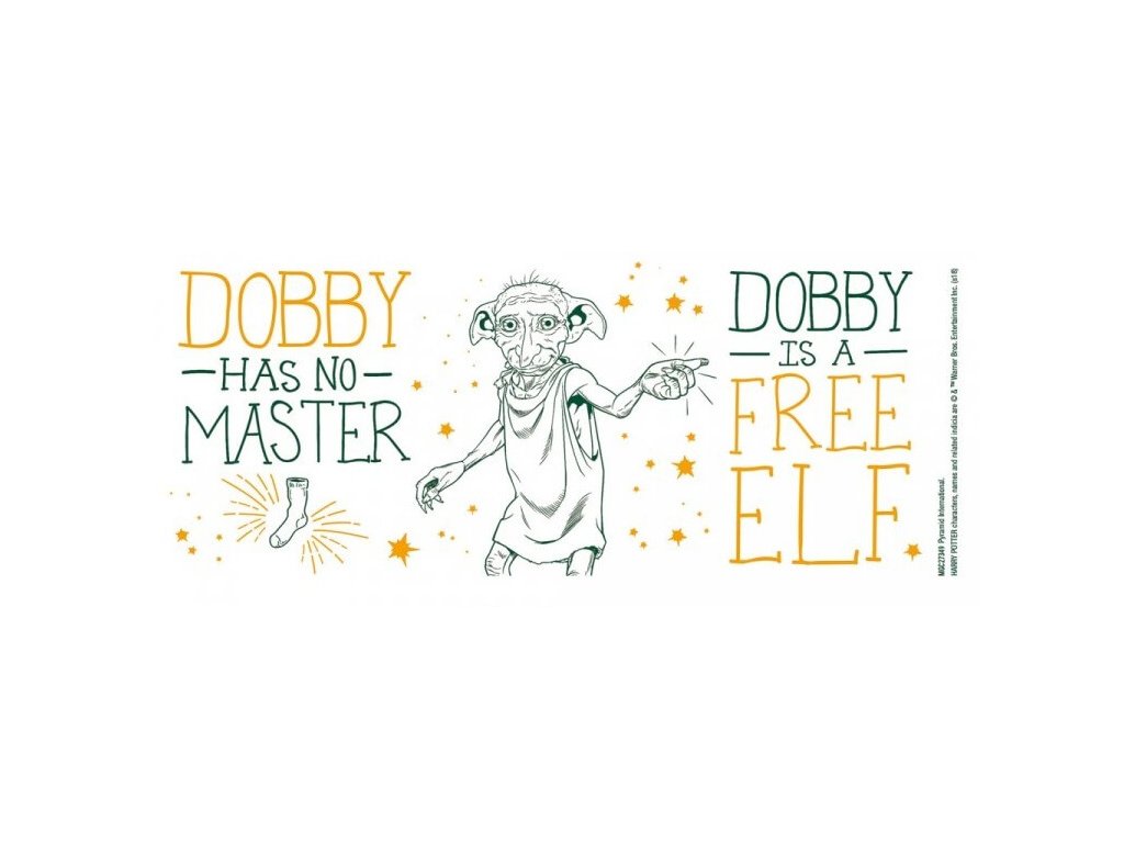 A bögrén Dobby képe látható, kezében a híres zoknival, és az ikonikus angol idézetek: „Dobby has no master”, „Dobby is a free elf”, ami magyarul annyit jelent: „Dobbynak nincs gazdája, Dobby szabad manó”. Hivatalos, licencelt Harry Potter termék, ami minden rajongó szívét megdobogtatja!