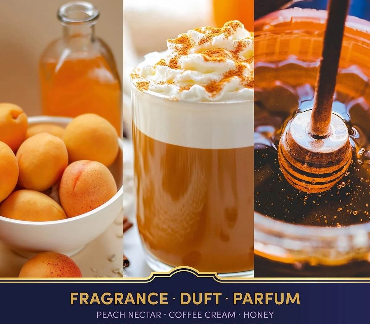 Édes, meleg illat az otthon érzésével. A kávé, az őszibarack és a narancs felső jegyei gazdag és hívogató nyitást adnak.