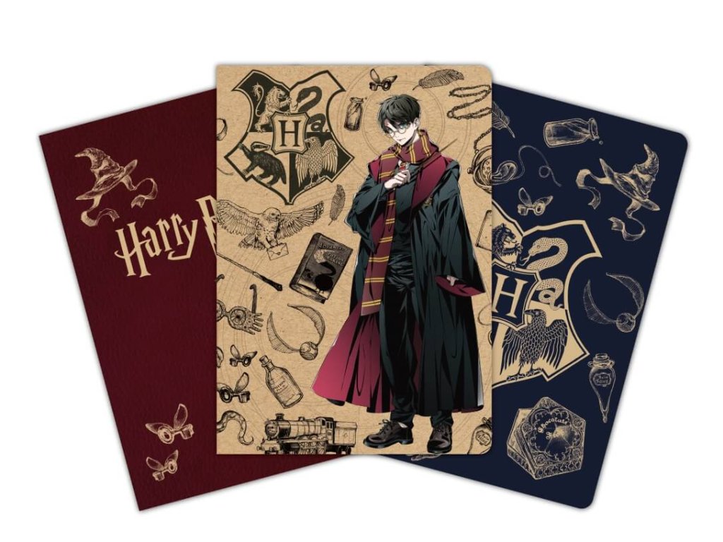Az első jegyzetfüzetet a filmsorozat ikonikus szimbólumai díszítik – Harry Potter, Hedvig bagoly a Roxfortból érkezett levéllel, a Roxfort Expressz, az aranycikesz és számos más, minden rajongó számára ismerős tárgy. A második füzet a Roxfort varázslóiskolának és címerének van szentelve. A harmadik egy elegáns, piros füzet arany Harry Potter logóval és visszafogott Teszlek Süveg illusztrációval – tökéletes a mindennapi varázslatos gondolatok lejegyzésére.