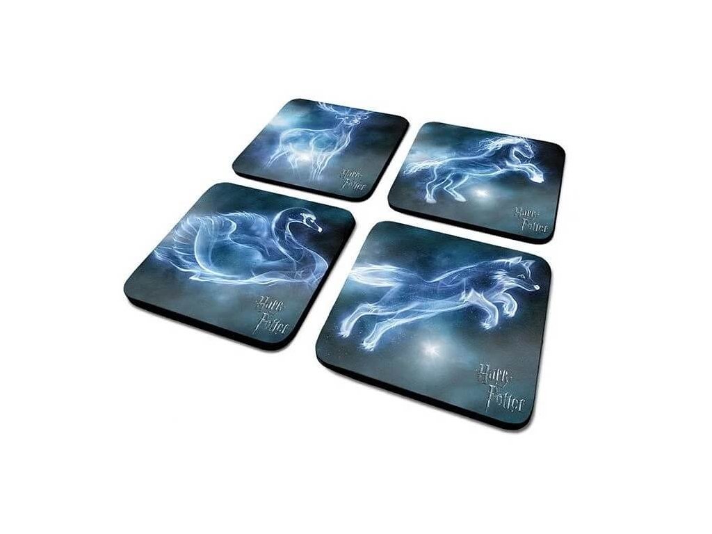 A szettben megtalálható a szarvas (Harry Potter patrónusa), a menyét (Ron Weasley patrónusa), a hattyú és a ló. A poháralátétek mérete 10 x 10 cm. A Harry Potter Expecto Patronum poháralátétek hivatalosan licencelt termékek.
