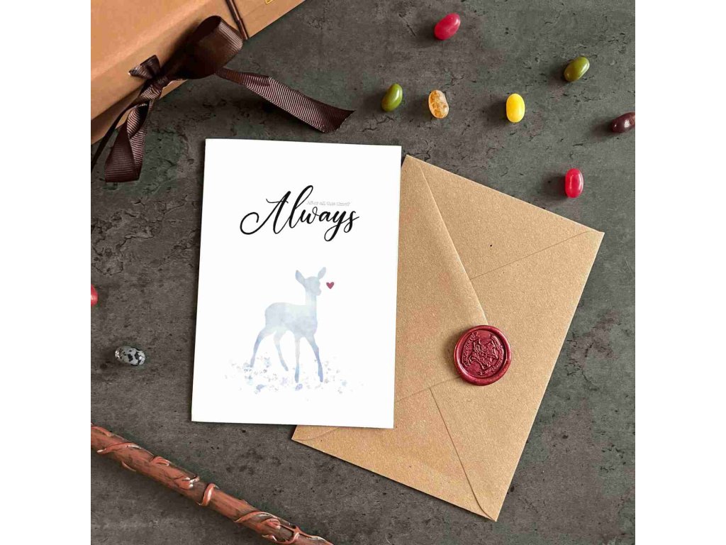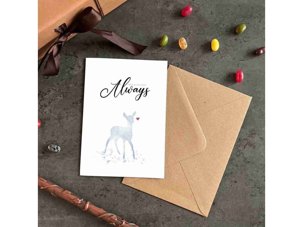 Fejezze ki érzéseit ezzel a varázslatos üdvözlőkártyával, amely a Harry Potter történet egyik legmeghatóbb pillanatából merít ihletet. A kártya a híres idézetet „After all this time? Always.” és egy gyönyörű szarvas motívumot visel, amely Severus Snape Patronusa, és elpusztíthatatlan szerelmét szimbolizálja Lily Potter iránt.