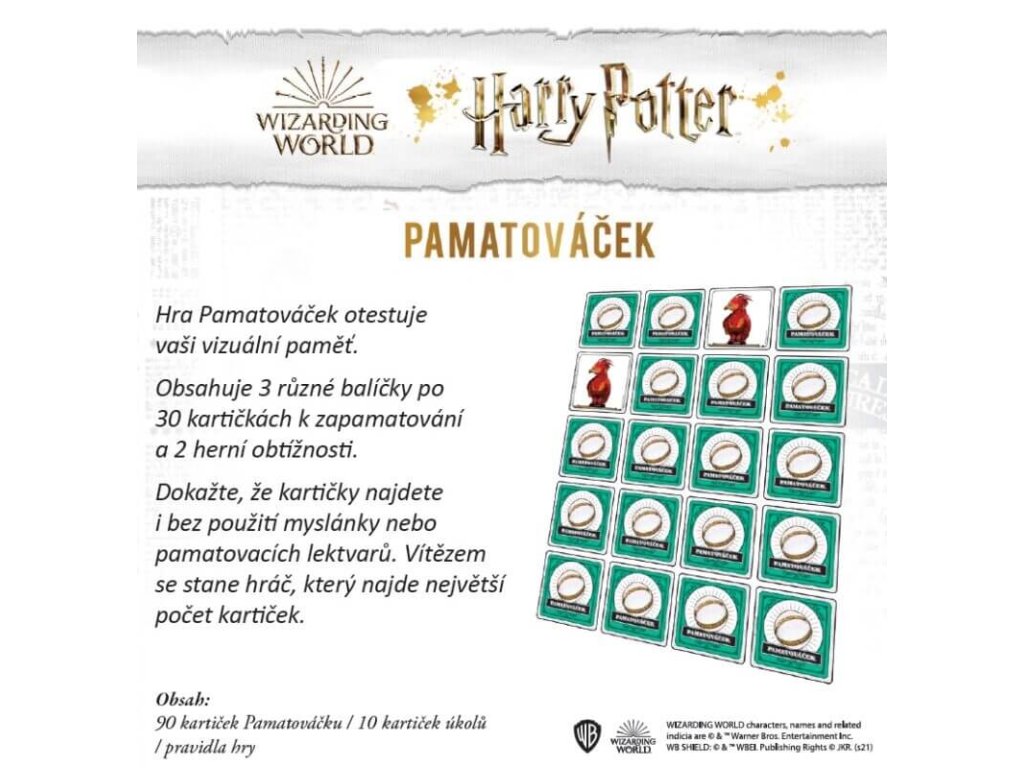 Találd meg az összes varázslatos kártyát varázslói képekkel a Harry Potter világából az Albus Dumbledore Emlékezetje nélkül is. Az nyer, aki a legtöbb kártyát találja meg. A játék 3 különböző 30 kártyás csomagot és 2 nehézségi szintet tartalmaz, valamint 10 kártyát különböző feladatokkal. A játék cseh nyelvű szabályokkal rendelkezik, és hivatalosan licencelt termék, amely biztosan örömet szerez minden Harry Potter rajongónak. A Harry Potter Emlékezet játékhoz nem szükséges alapos ismeret a Harry Potter sorozatról, így a nagyszülők is nyugodtan játszhatnak a gyerekekkel.